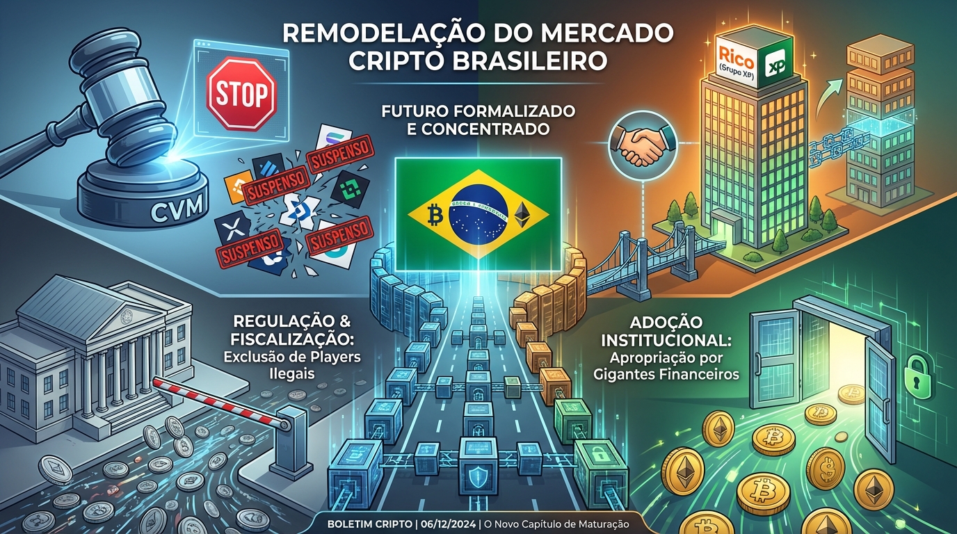 O mercado de criptomoedas no Brasil atravessa um momento de profunda remodelação estrutural, com forças opostas que, juntas, sinalizam um novo capítulo de maturação. De um lado, a Comissão de Valores Mobiliários (CVM) intensifica a fiscalização, emitindo ordens de suspensão para corretoras estrangeiras que atuam ilegalmente, especialmente no mercado de derivativos. Do outro, gigantes do sistema financeiro tradicional, como a Rico (Grupo XP), aprofundam sua aposta no setor, expandindo operações e contratando talentos com foco explícito em ativos digitais. Esse movimento duplo – de exclusão regulatória e apropriação institucional – está ativamente redesenhando o cenário para os investidores brasileiros, empurrando o capital e a força de trabalho para um ambiente mais formalizado e concentrado. O que isso significa para o futuro do seu portfólio? A resposta está na análise a seguir.